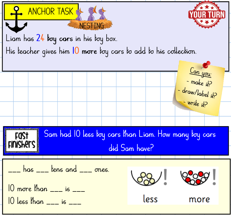 Maths lessons begin with an anchor task set in a real-life context, encouraging children to unpick a reasoning or problem-solving question through mixed-ability paired discussion. Following this, the main learning intention (WALT) and key vocabulary are introduced. All children are taught the same age-related content, with adaptations made where necessary to ensure the learning is accessible to all. Mixed-ability pairings promote collaboration and peer learning, with reasoning and problem solving in real-life contexts forming the basis of each lesson and woven throughout. Common misconceptions are identified and addressed through the main teaching, supporting children to develop secure and confident mathematical understanding.