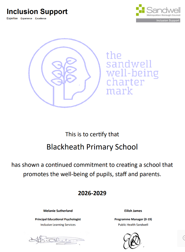 Blackheath Primary School has successfully completed the Wellbeing Charter Mark awarded by Sandwell Inclusion Support, recognising our whole-school commitment to promoting positive mental health and emotional wellbeing.